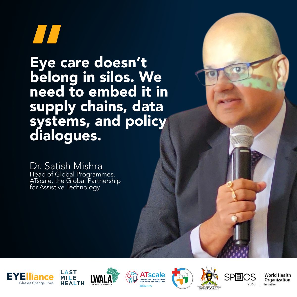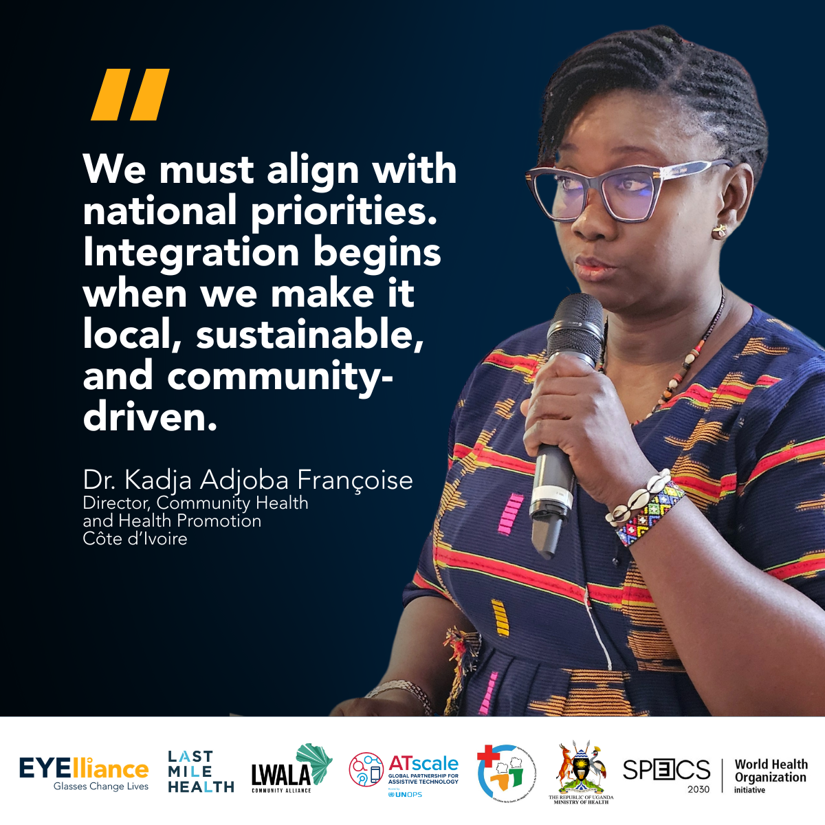 The event was attended by an esteemed panel of global health leaders including Maggie (Savage) Dawson, COO at EYElliance; Dr. Adjoba Françoise KADJA, Director of Community Health and Health Promotion at Côte d’Ivoire’s Ministry of Health; Dr. Jimmy Ochorin, Senior Medical Officer, Disability and Rehabilitation, Ministry of Health, Uganda; Dr. Stuart Keel, Technical Officer for Blindness Prevention at the World Health Organization SPECS 2030; Mallika Raghavan, MPH, Deputy Chief Program Officer at Last Mile Health; Kenneth Ogendo, Director of External Affairs, Policy, Advocacy & Partnerships at Lwala Community Alliance; and Dr Satish Mishra, Head of Global Programmes at ATscale, the Global Partnership for Assistive Technology.